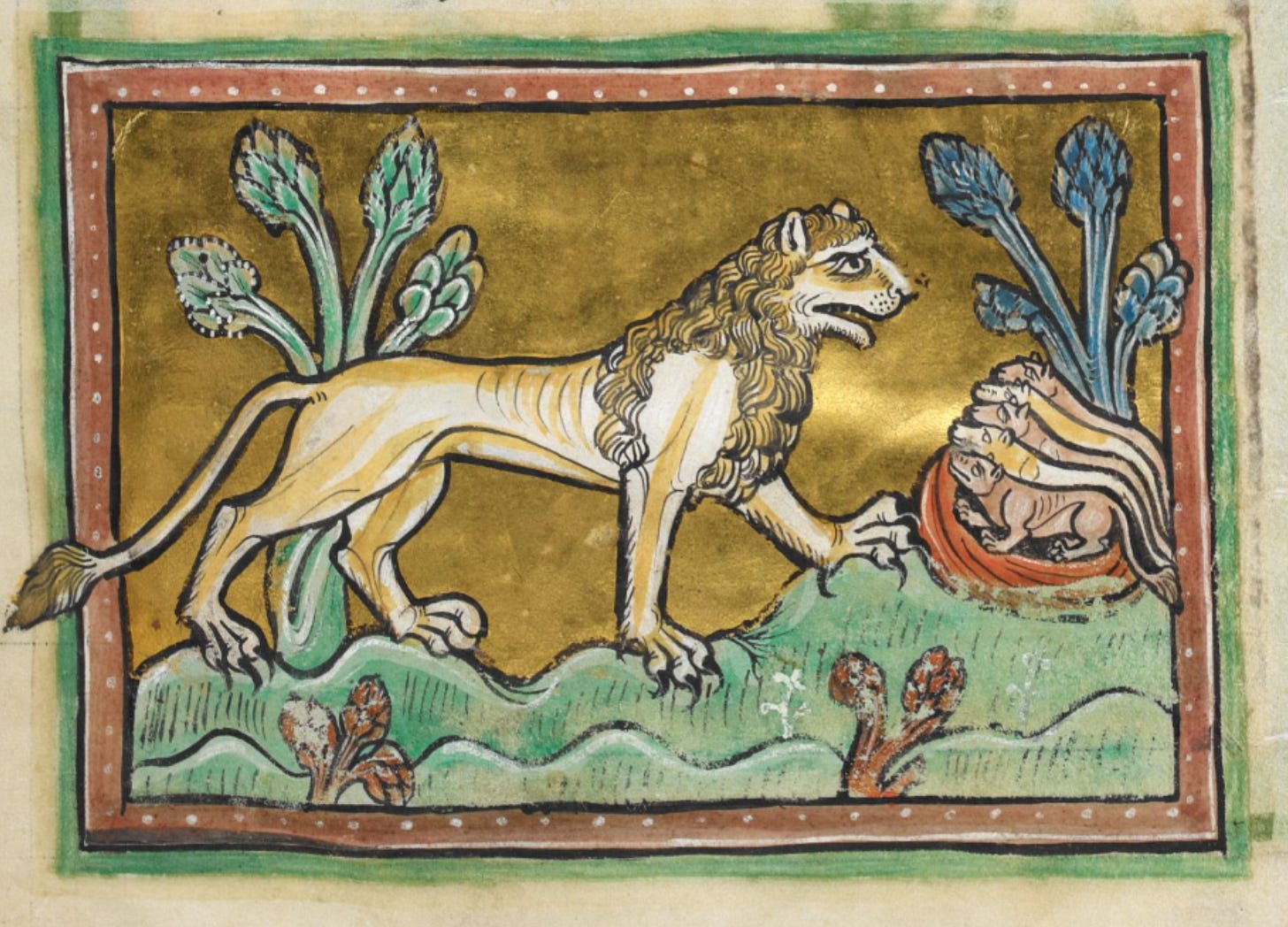 The Christian Lion: Bestiaries describe stillborn baby lions brough back to life after three days by their father’s breath, a clear allegory for the Resurrection.